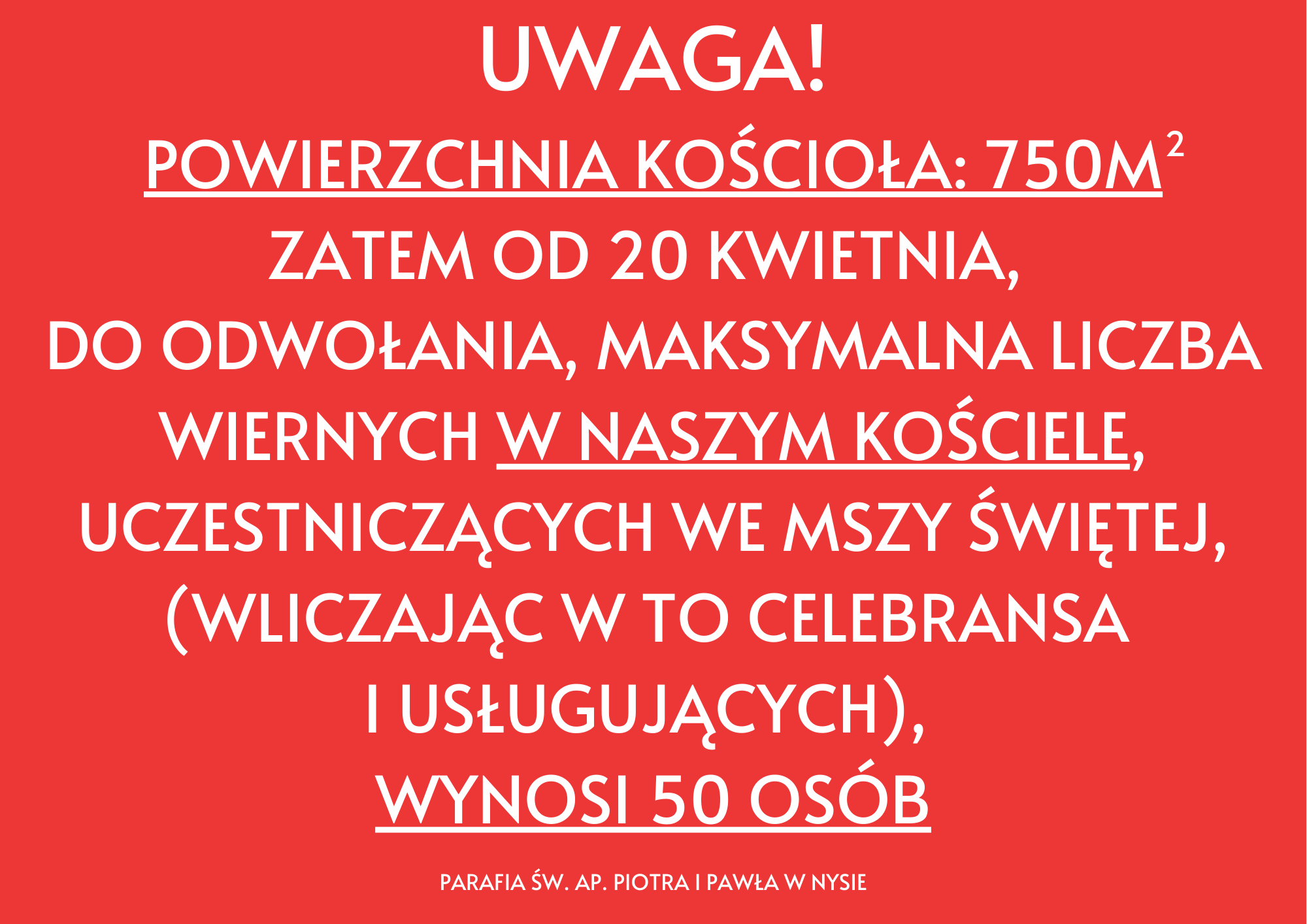 Zatem OD 20 KWIETNIA, DO ODWOŁANIA, maksymalna liczba wiernych W NASZYM KOŚCIELE, uczestniczących we Mszy Świętej (wliczając w to celebransa i usługujących), WYNOSI 50 OSÓB❗️