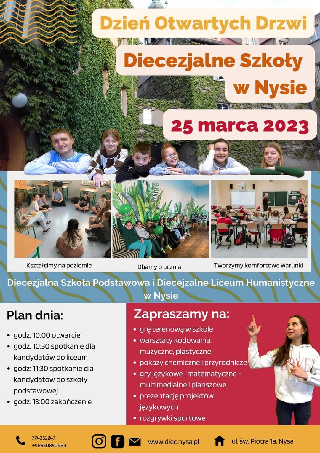 Diecezjalna Szkoła Podstawowa oraz Diecezjalne Liceum Humanistyczne w Nysie, zapraszają na Dzień Otwartych Drzwi, w sobotę, 25 marca, od godz. 10:00. Więcej szczegółów na plakatach 🏫