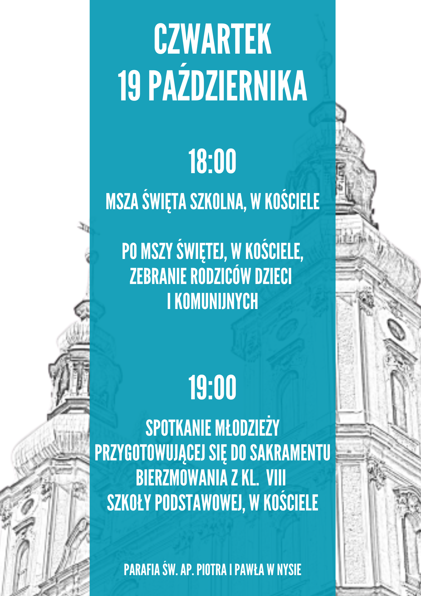 Natomiast o godz. 19:00, w kościele, odbędzie się Spotkanie Młodzieży przygotowującej się do Sakramentu Bierzmowania, z kl. VIII Szkoły Podstawowej 🕊