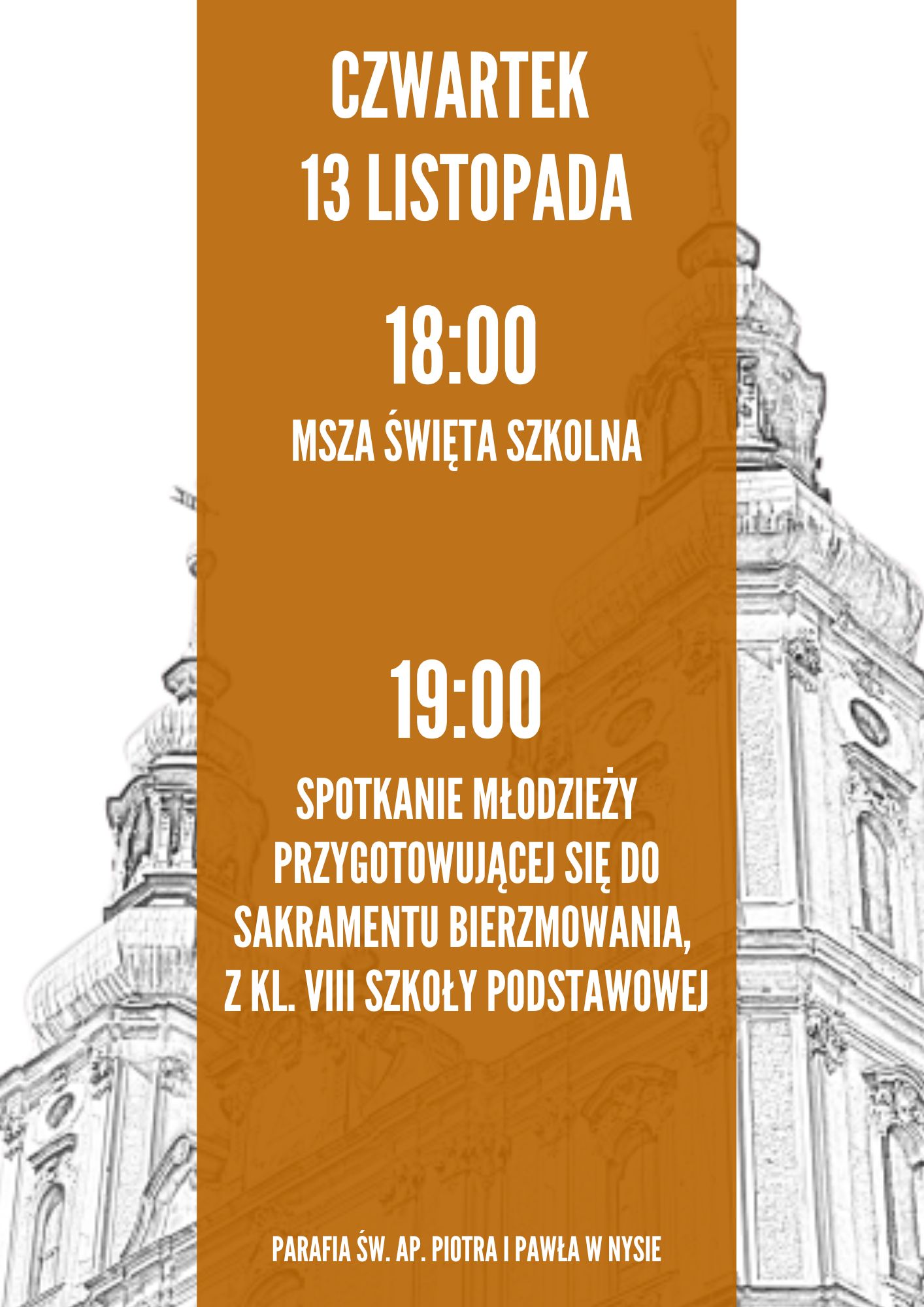 Również dziś, o godz. 19:00, w kościele, odbędzie się Spotkanie Młodzieży przygotowującej się do Sakramentu Bierzmowania, z kl. VIII Szkoły Podstawowej
