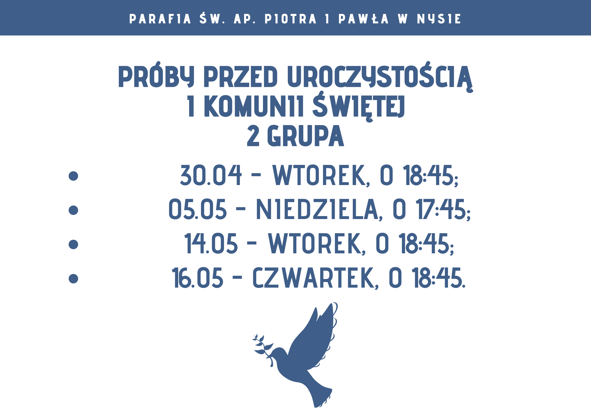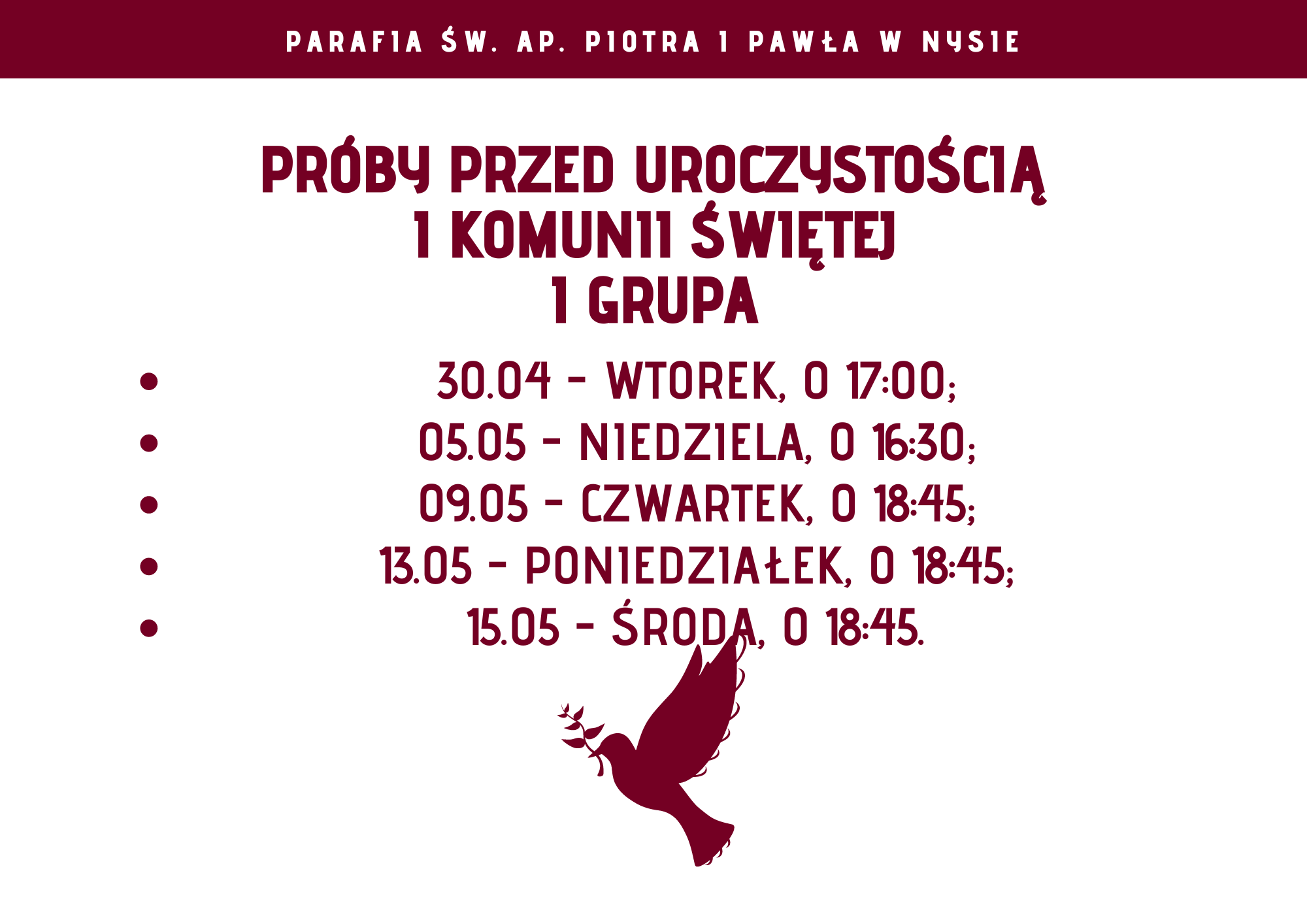 🔹️18:45 – Próba przed Uroczystością I Komunii Świętej (1 grupa) 🙏